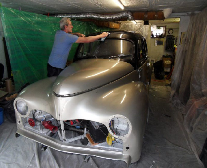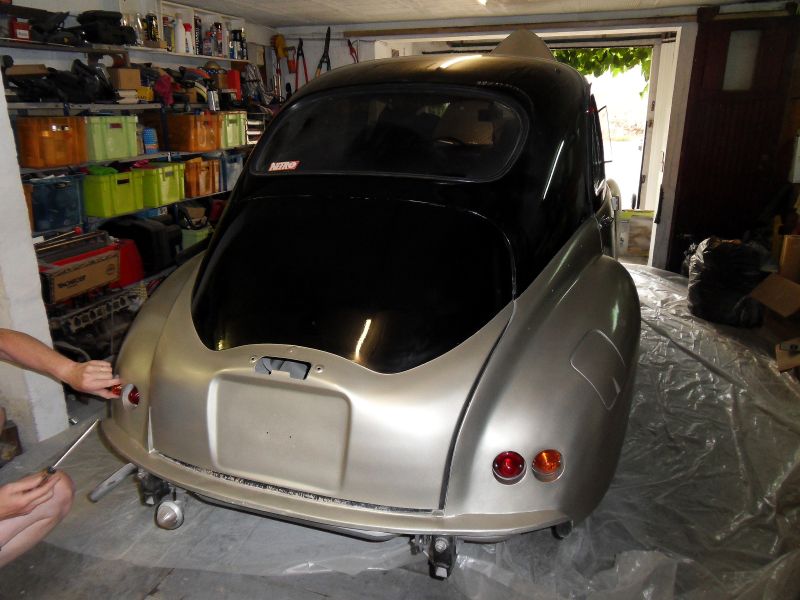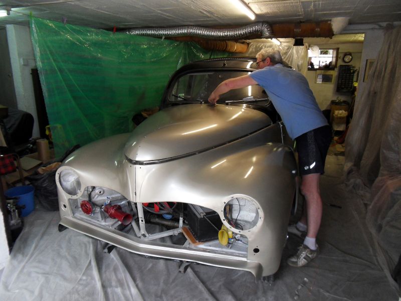 Le 11 Juillet la peinture appliquée est un beige clair métalisée moderne d'une Volvo V60 de 2016 , après trois couches de vernis , les papiers sont retirés , je remonte les clignotants le pare choc avant , la calandre avec ses feux de broulliards et la plaque d'imatriculation arrière .