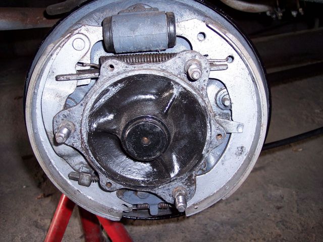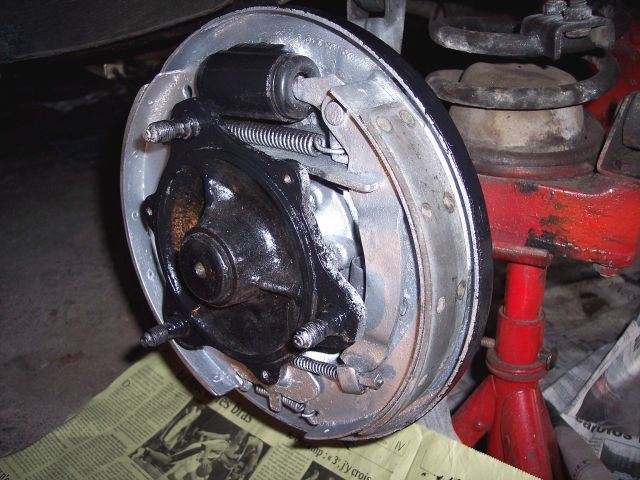 freins avant en 2005 seule photo que je posséde lors du démontage et remontage , les garnitures sont changées le cylindre de roue avant gauche avait été changé en 1993 ,celui de droite en 1995 et les 4 tambours de freins avaient été rectifiés en 1998 , ils sont repeint avec une peinture haute température , il faut une clé carrée pour le réglage de ces garnitures . Les roulements de roues avant et arrière sont réglés .