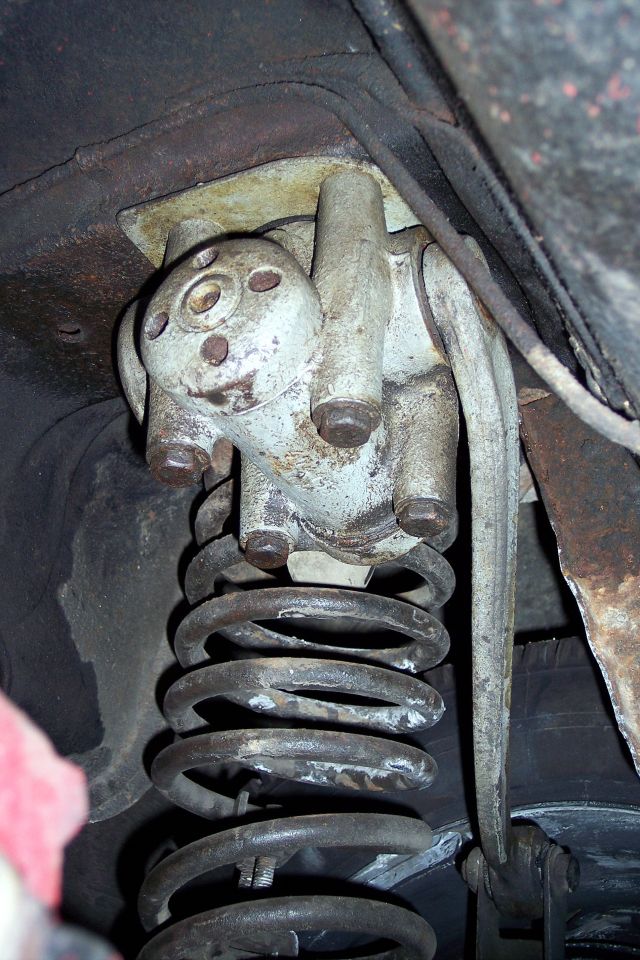 Les deux amortisseurs sont redémontés en 2013 , remplacés par deux autres amortisseurs achetés d’occasion à Reims en 2006, pas facile à dévisser le bouchon , j’utilise une ancienne clé dynamométrique sur laquelle je fixe dessus un écrou 6 pans de O 26 , ne pas utiliser de burin car ces bouchons cassent . Vérifier qu’il ne fuit pas sinon il faut les démonter entièrement et changer les roulements les joints spi . Les silents blocs d’amortisseurs souvent HS sur les 203 , ils sont remplacés par des neufs . Ensuite ils sont ponçés et l’antirouille appliqué , repeints ,vidangés , huile usée est remplacée par de l’huile hydrolique viscositée 107 .