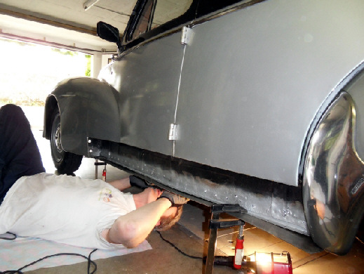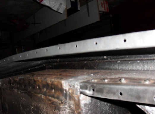 La plaque de fer en L est soudée sur le longeron gauche , des trous espacés de 4,5 cm sont réalisés pour pouvoir souder point par point la plaque de 15 cm x 1,70 m positionnée dessus