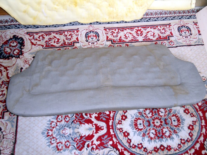 Je commence le capiton par la banquette du bas , le tissus d’origine est retiré , pour faire le capiton j’ai decoupé une épaisseur de mousse de 15 cm que je réutilise de façon à ce que