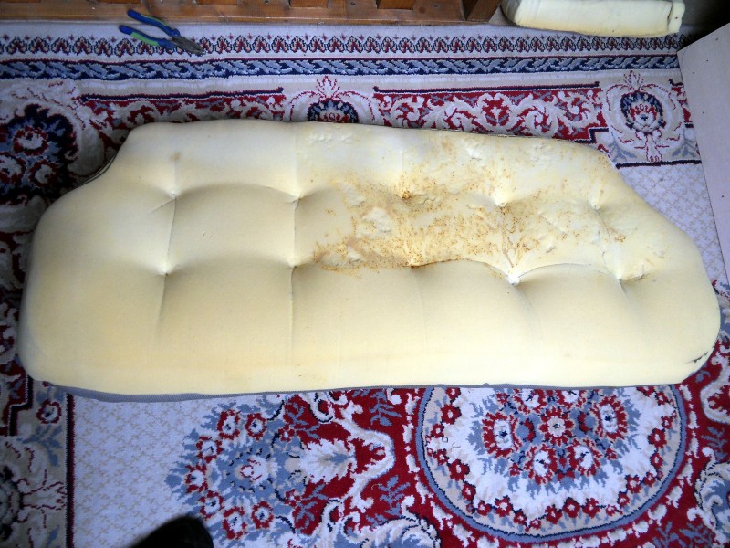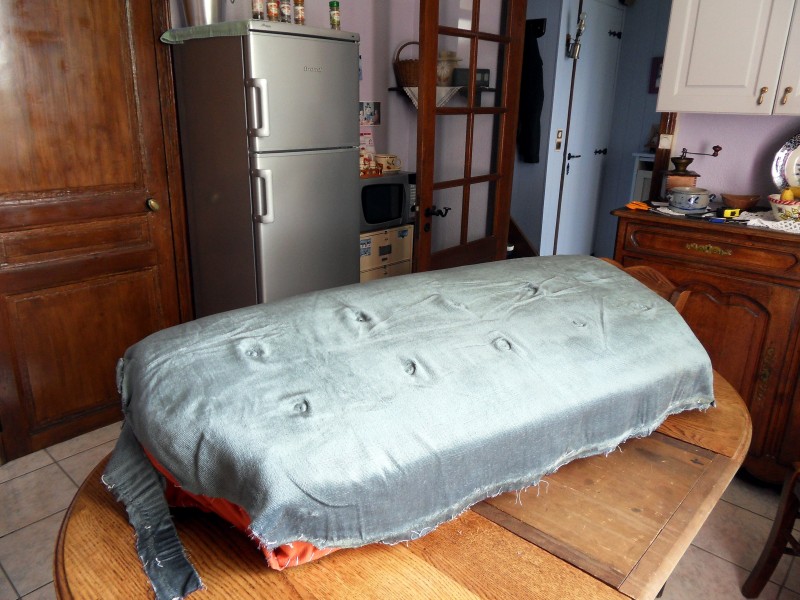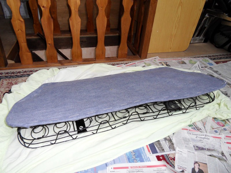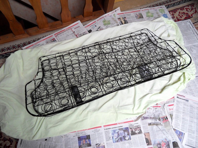 J’ai dérouillé les ressorts et appliqué le rustol ensuite j’ai appliqué une peinture noire restom ,il faut au minimum 48 hrs de séchage , puis j’ai posé un morceau de moquette de la forme de la banquette