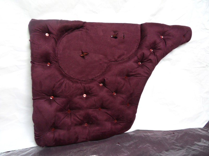 L’ancien velours du siége passager se compose de 9 piéces à découper sur le nouveau tissus et de 12 boutons de diamètre 22 mn mis sous presse avec une chute de tissus bordeaux .