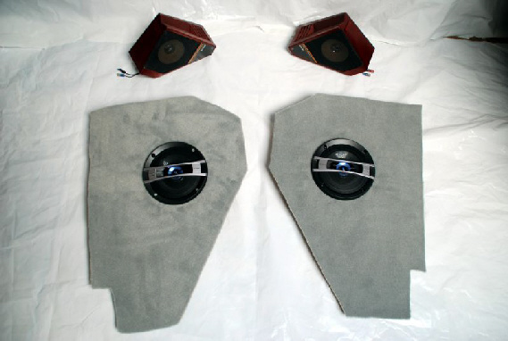 Les deux HP arrière sont repeints couleur bordeaux , deux nouveaux haut parleur avant sont encastrés sur deux plaques fibre et moquette collée . L’ntérieur des portes sont traitées à l’antirouille , un film plastique est posé sur chaque porte pour les proteger .