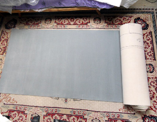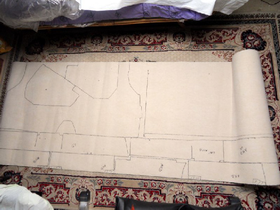 J’ai choisi une moquette de couleur grise largeur 1m x 5 m qui s’accorde bien avec la couleur bordeaux des sièges , j’ai enlevé tous les morceaux de l’ancienne moquette car ils m’ont servis de modéle pour faire les tracés à l’envers sur la moquette neuve , je peux maintenant commencer la coupe de celle ci .