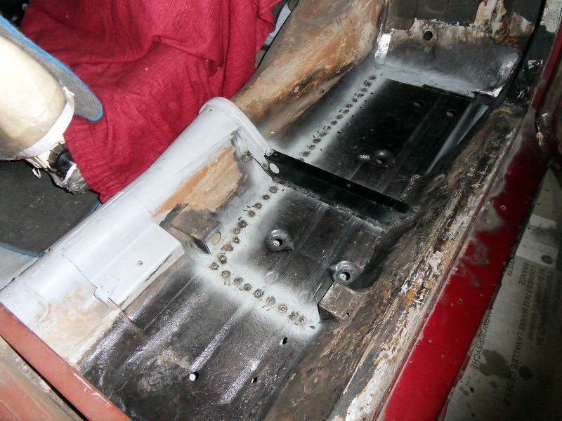 Le plancher passager est ressoudé par point au mig , la traverse neuve est soudée sur le plancher , il ne reste plus qu’à meuler et repeindre le plancher avec une peinture Restom satin noire.