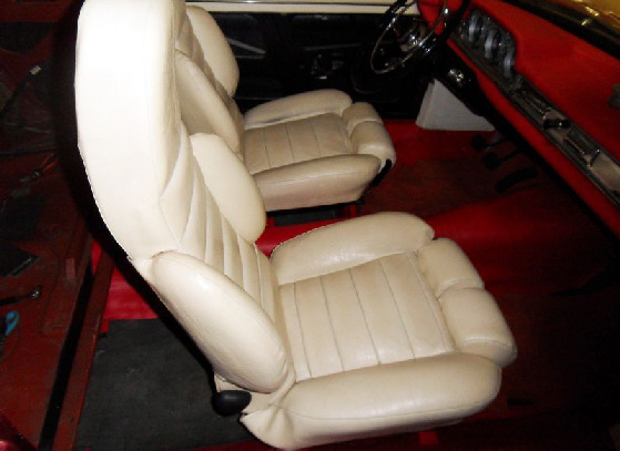 Les deux sièges avant sont remontés ,un skai rouge est posé sur le tunnel avant et sur les côtés un skai blanc est posé au niveau des haut parleur .