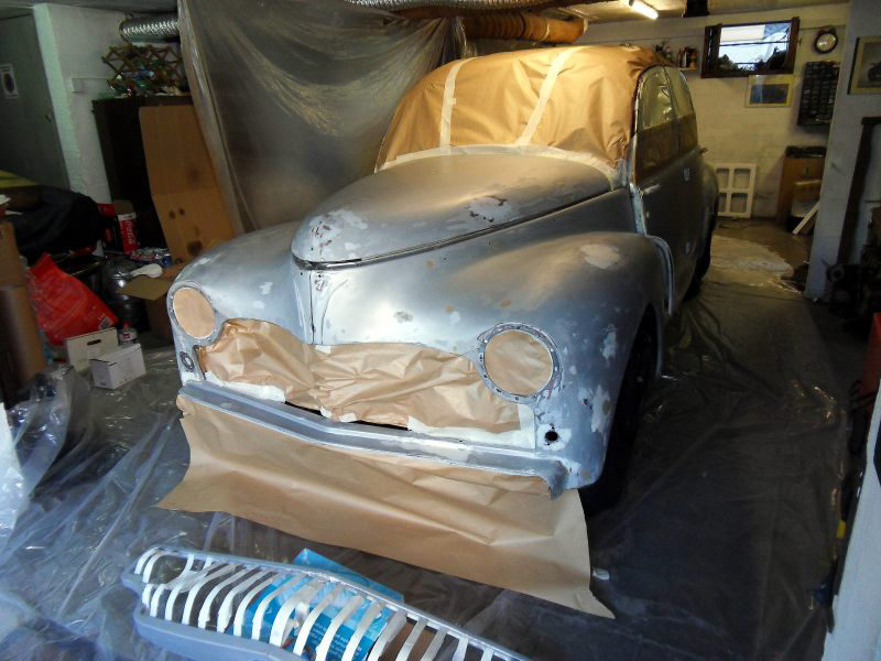 Juin 2021 , j'ai apporté la 203 chez mon frère c'est lui qui peindra la voiture , comme nous ne possédons pas de cabine de peinture , nous installons des baches de plastique au sol et tout autour de la 203 . Il y a quelque retouche à faire avant de pulvériser l'apprêt . Nous protégeons avec du papier craft et du scocht tous les endrois qui ne seront pas peint nous avons mis deux heures pour faire ce camouflage .