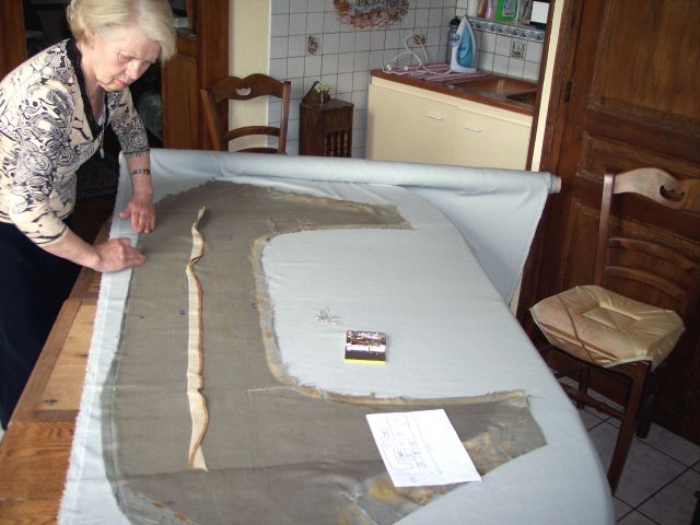 Il faut bien disposer les anciennes pièces de tissu sur le velours neuf , poser des épingles , faire la découpe , coudre trois rubans tubulaires afin de pouvoir passer les trois barres rondes pour tendre le velours en suivant la forme du toit
