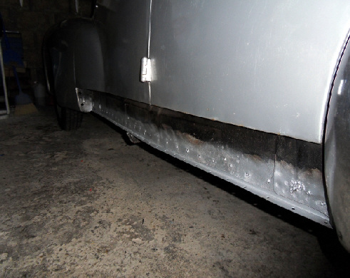 La plaque de fer en L est soudée sur le longeron gauche , des trous espacés de 4,5 cm sont réalisés pour pouvoir souder point par point la plaque de 15 cm x 1,70 m positionnée dessus