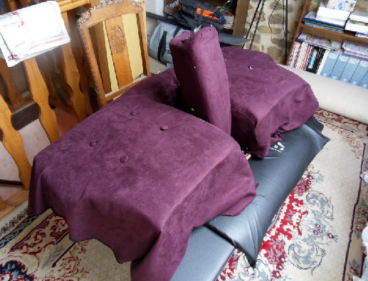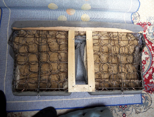 je laisse le tissus d’origine il n’est pas abimé et je rajoute une épaisseur de mousse de 15cm , antirouille + peinture noire restom appliquée sur les ressorts