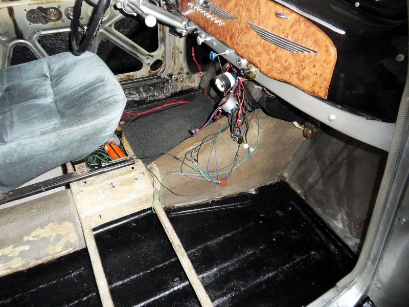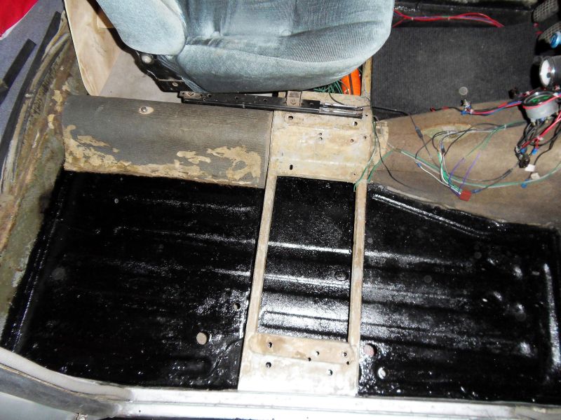 il faut attendre qu’il séche une journée puis j’applique un antirouille . Ensuite je pose une peinture époxy rustom noir sur les planchers , sur le longeron et sur la plaque neuve .