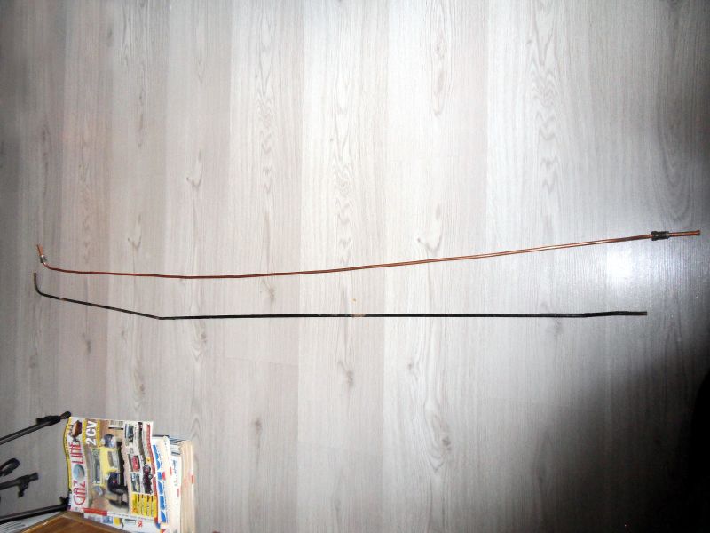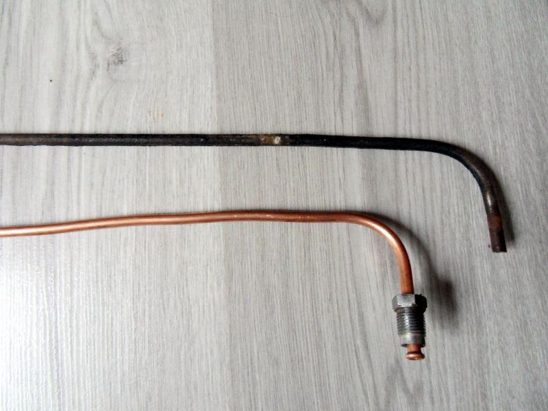 le maitre cylindre retiré , j’en ai profiter pour démonter le tuyau central de frein en fer , le modele m’a servi pour le faire refaire chez les Ets Dumont . Les deux tuyaux à l’avant avaient été changés en 1999 .